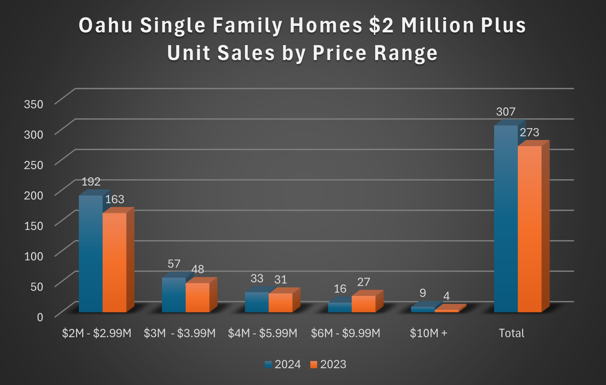 The O’ahu luxury real estate market in 2024 showed an overall increase in activity. This was particularly true in the single-family home market. Sales in homes priced above $2 million were up across most price ranges compared to 2023. The number of homes sold increased from 273 in 2023 to 307 in 2024, reflecting a broader demand.